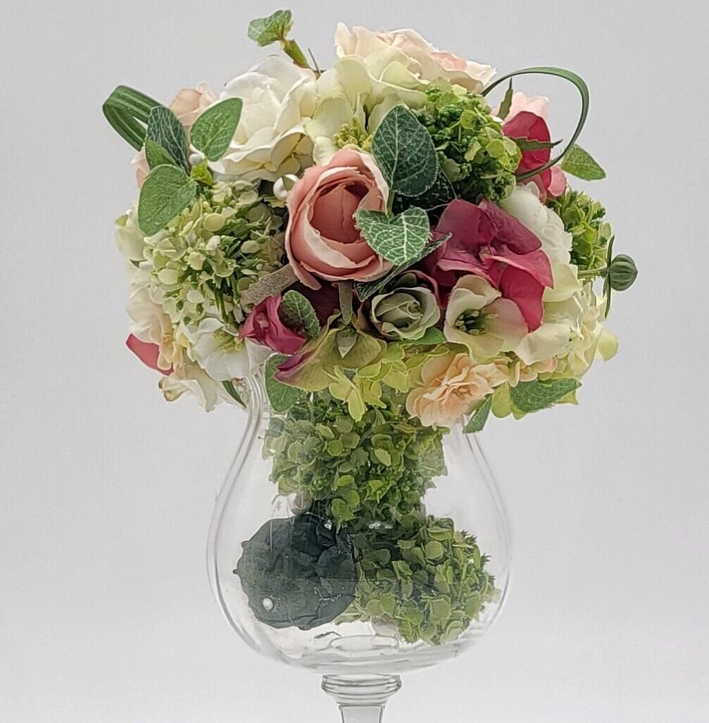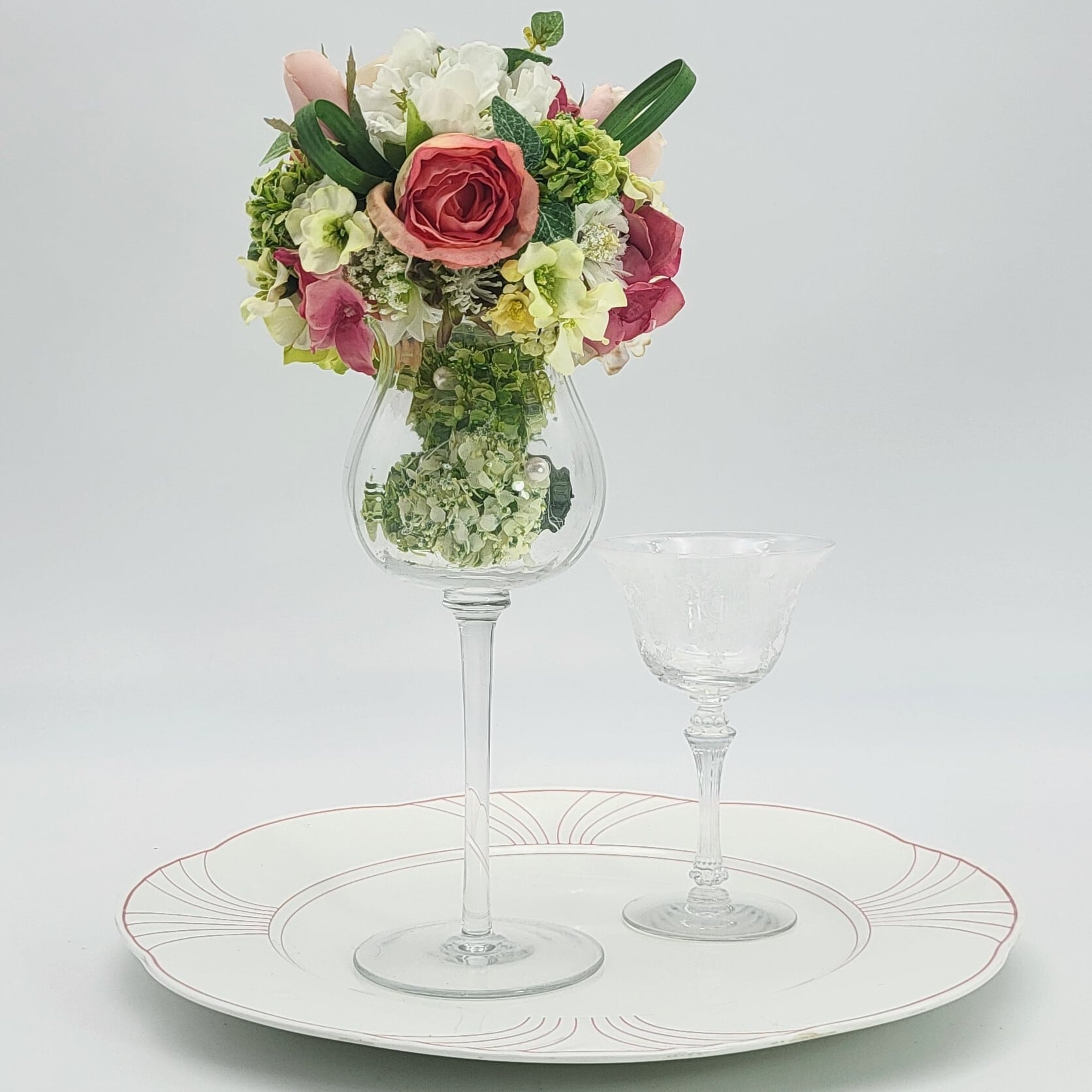 バラとアジサイをメインに可愛らしさとエレガントさを表現したグラスアレンジ