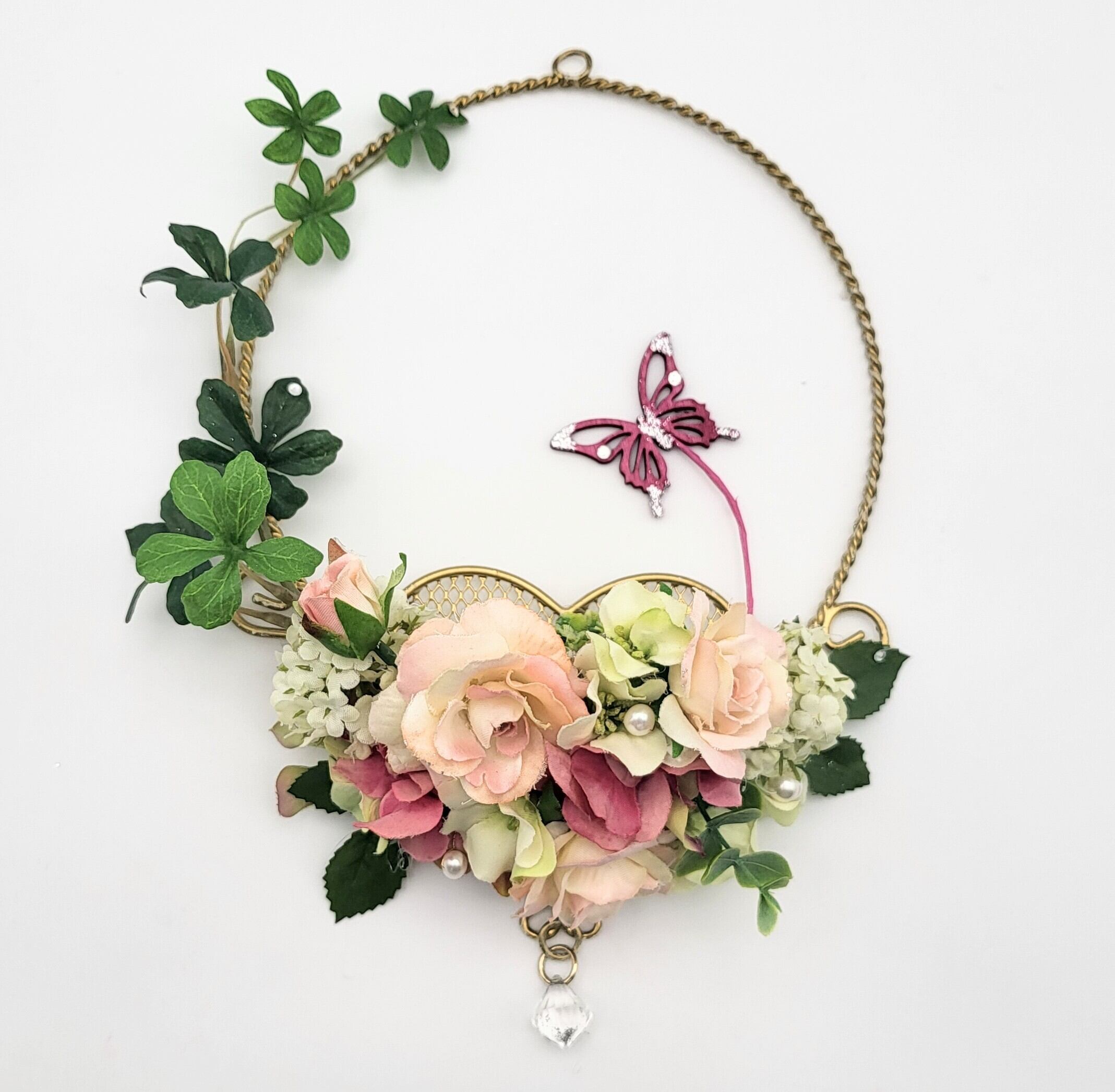 ピンクの蝶、クリスタル、淡水パールがアクセント。