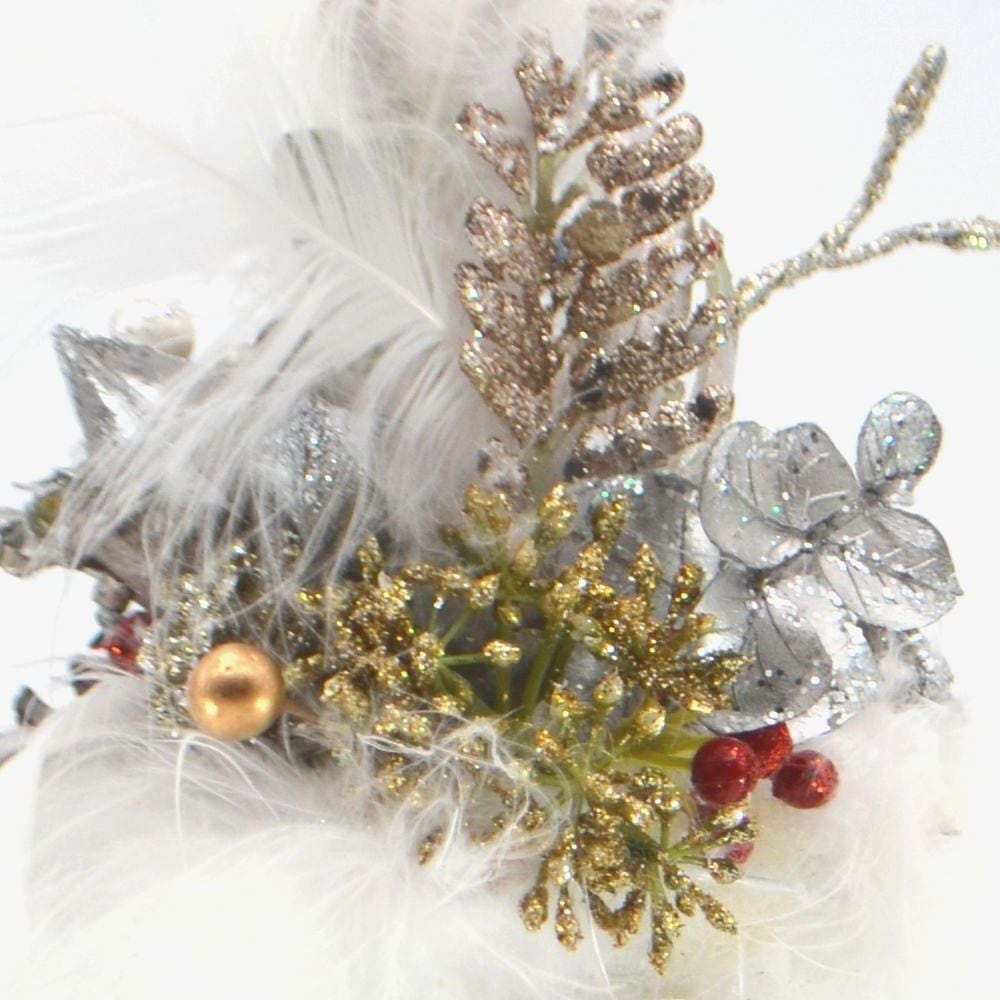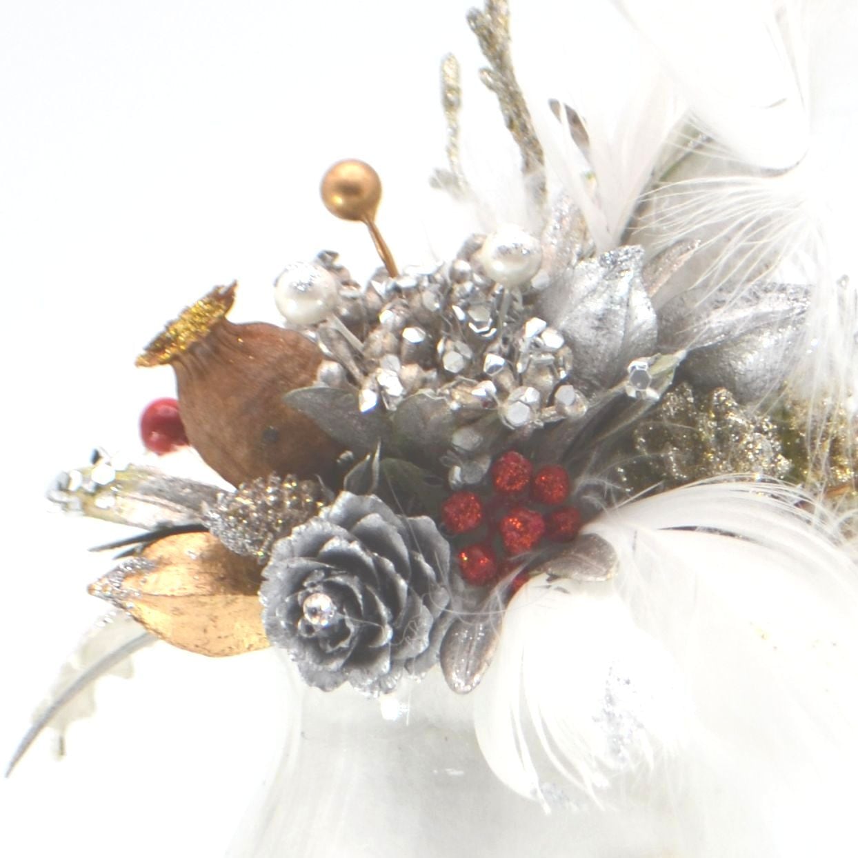 ホワイト&シルバーオーナメント・グラスアレンジは、エレガントで洗練されたデザインが特徴のアレンジメントです。清らかなホワイトのアーティフィシャルフラワーと、シルバーのオーナメントが美しく調和し、お部屋に特別な華やかさを添えます。クリスタルの輝きとフェザーの柔らかさが、上品な雰囲気を演出し、特にクリスマスや特別なお祝い事のインテリアにぴったりです。