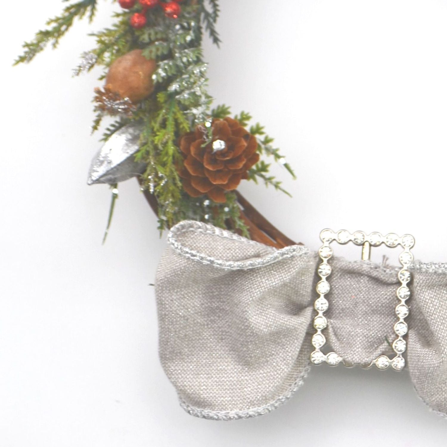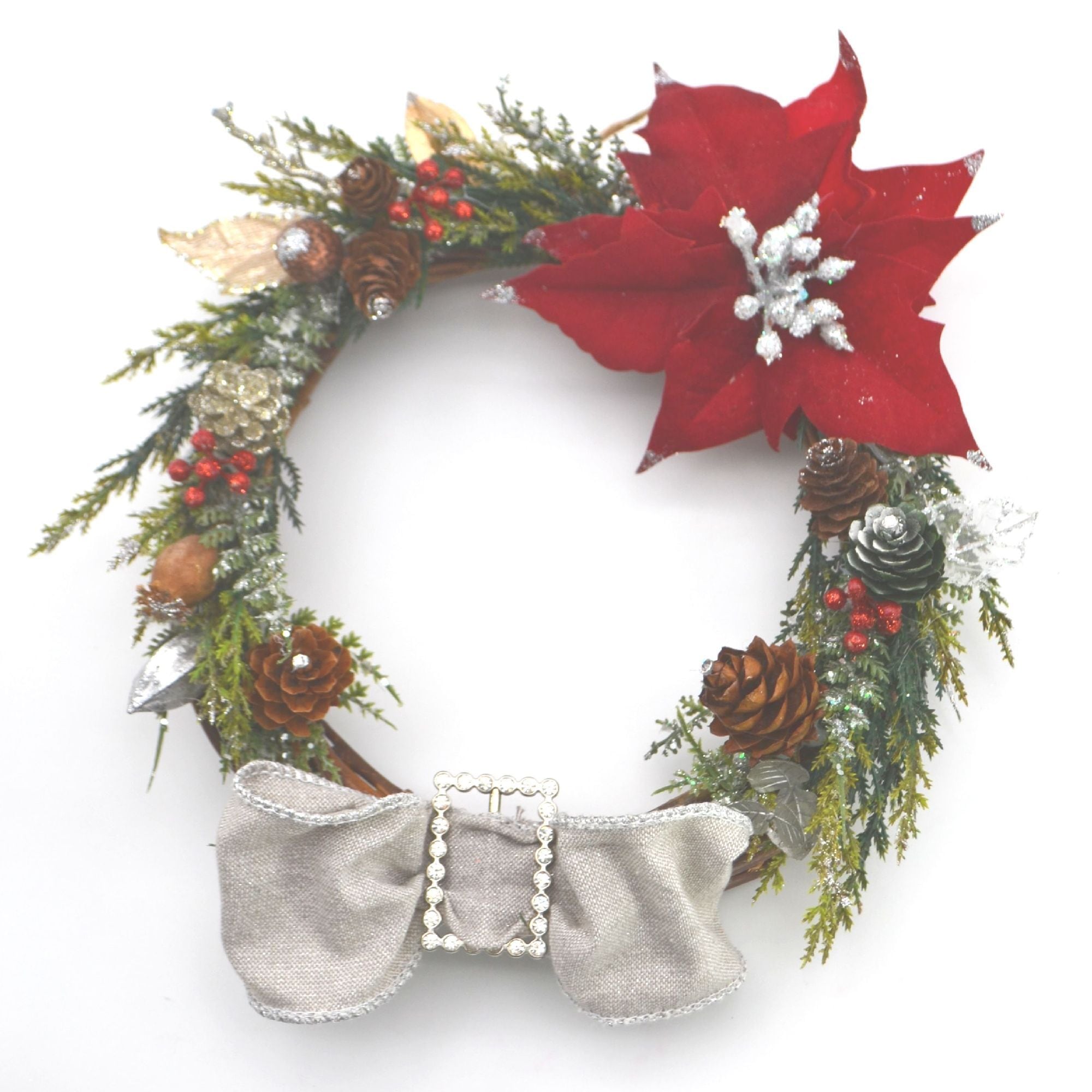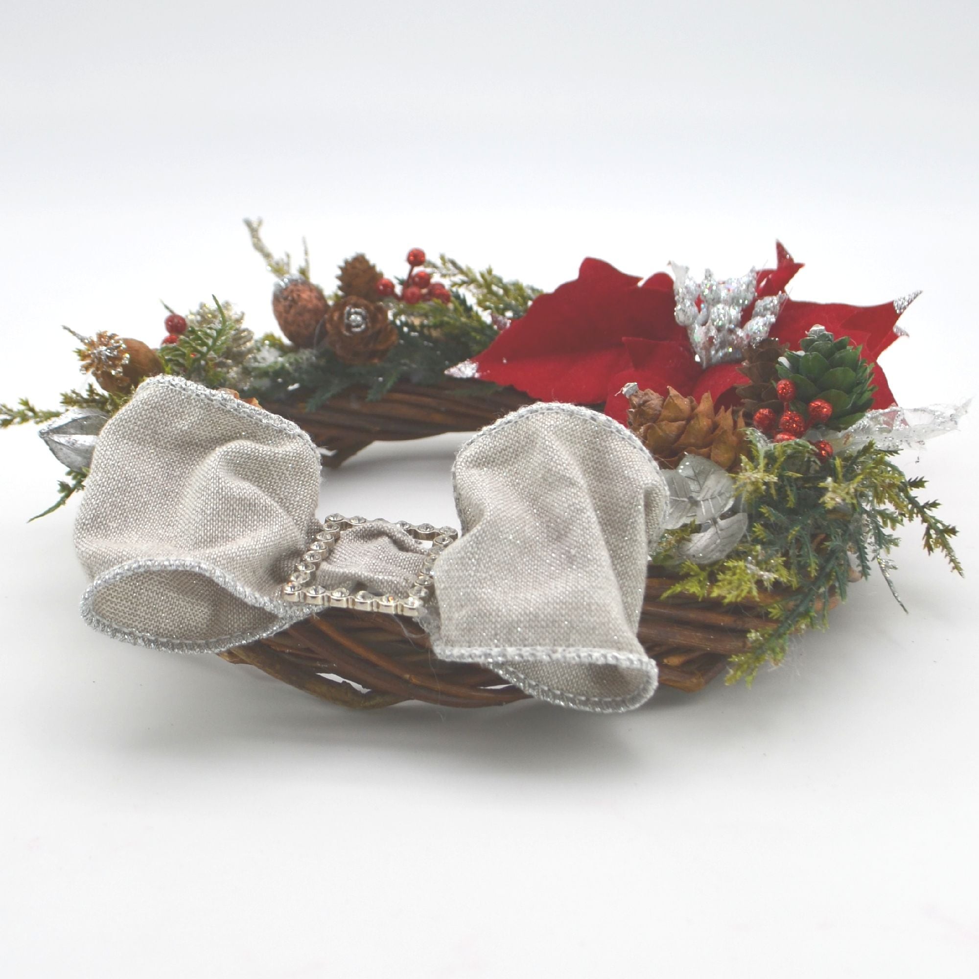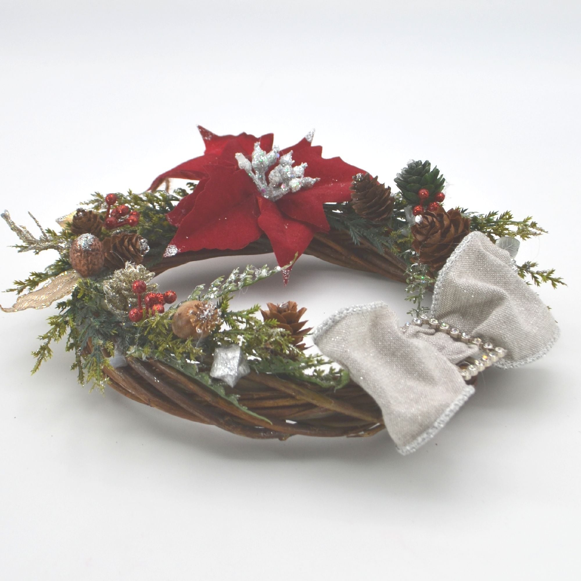 ポインセチア&クリスタル付リボン・リースは、洗練された斬新なデザインのアレンジメントです。鮮やかなポインセチアの花と煌めくクリスタルリボンが美しく調和し、お部屋に特別なクリスマスの雰囲気を演出!!