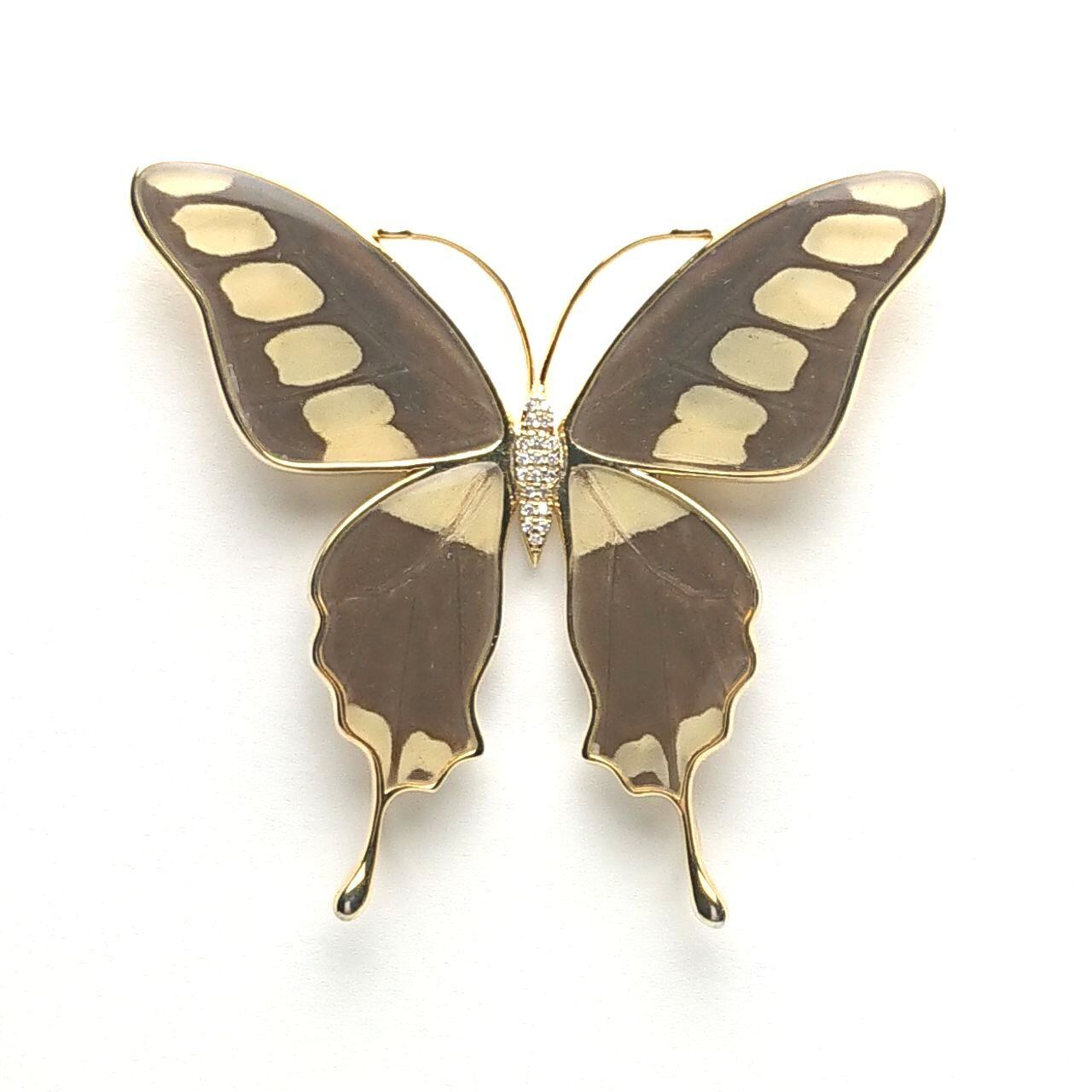 アフリカ産蝶の羽根を蝶の枠型に嵌め込み両表面を樹脂で保護し、胴体にはキュービックジルコニアを埋め込んだ美しいフォルム。強力なマグネットで挟み込む方法で装着します。通常のブローチのようなピン穴が残りませんので革製品や、コート等のやや厚手の生地にも装着出来ます。