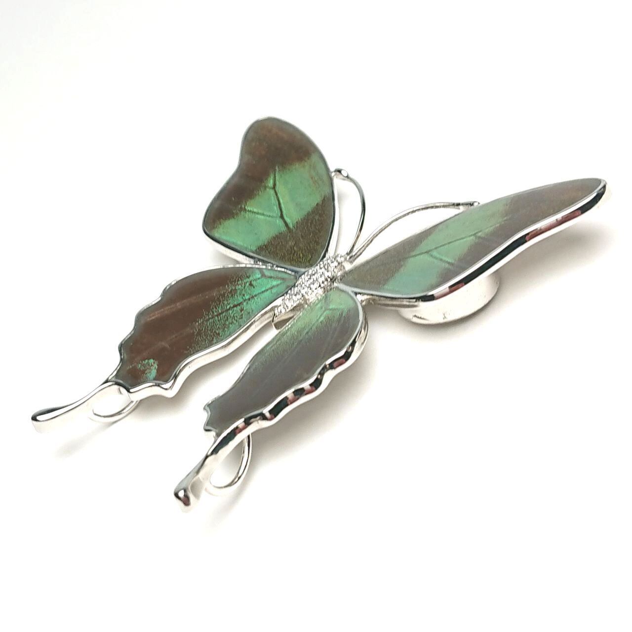 アフリカ産蝶の羽根を蝶の枠型に嵌め込み両表面を樹脂で保護し、胴体にはキュービックジルコニアを埋め込んだ美しいフォルム。強力なマグネットで挟み込む方法で装着します。通常のブローチのようなピン穴が残りませんので革製品や、コート等のやや厚手の生地にも装着出来ます。