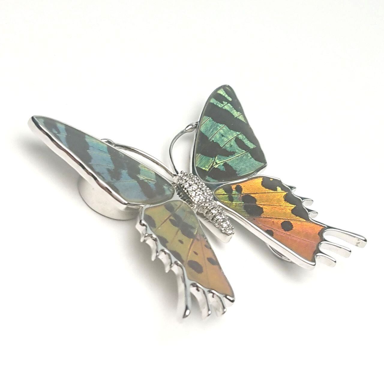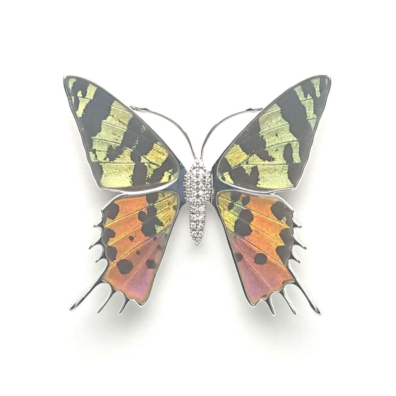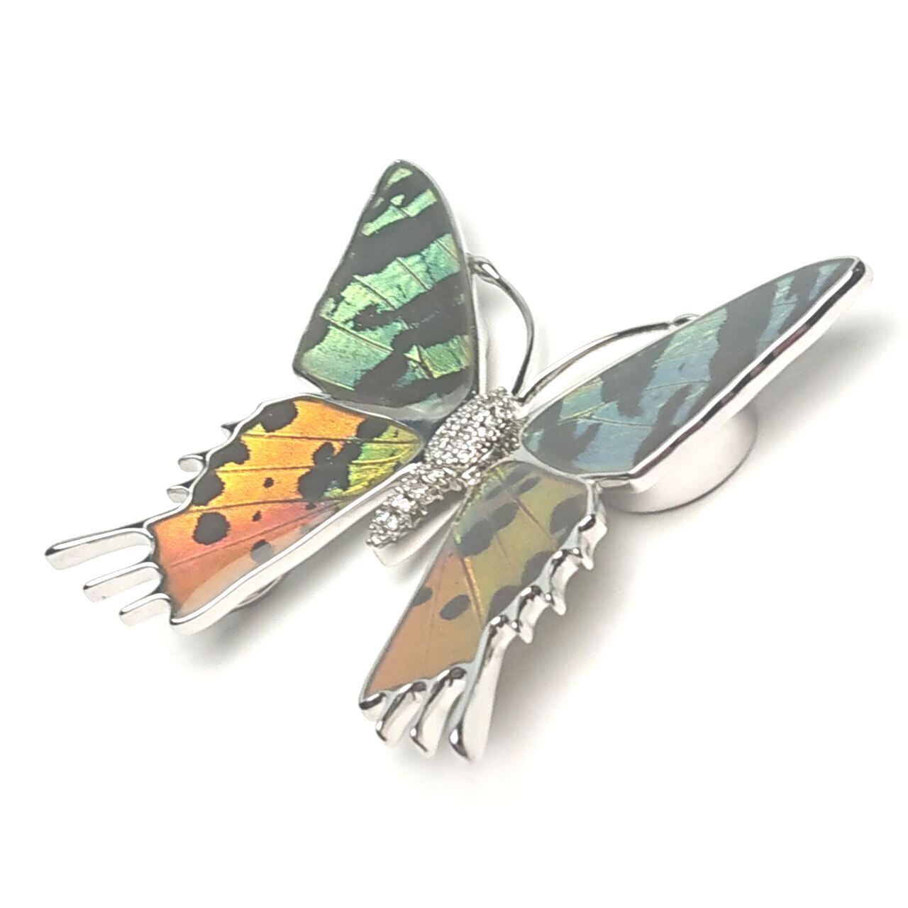アフリカ産蝶の羽根を蝶の枠型に嵌め込み両表面を樹脂で保護し、胴体にはキュービックジルコニアを埋め込んだ美しいフォルム。強力なマグネットで挟み込む方法で装着します。通常のブローチのようなピン穴が残りませんので革製品や、コート等のやや厚手の生地にも装着出来ます。