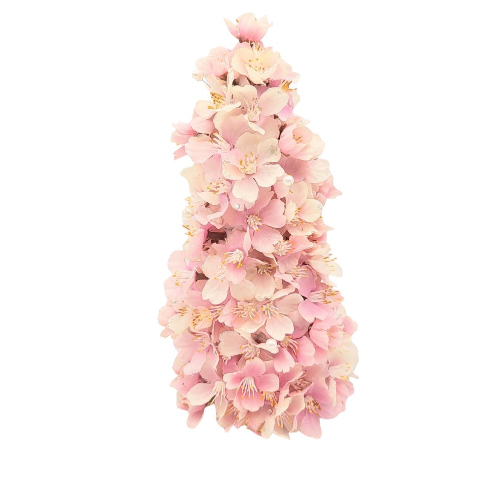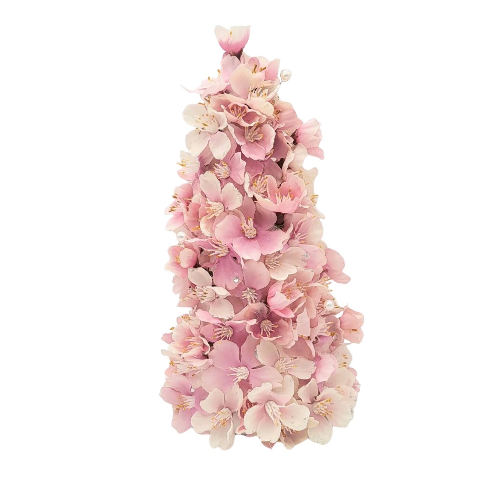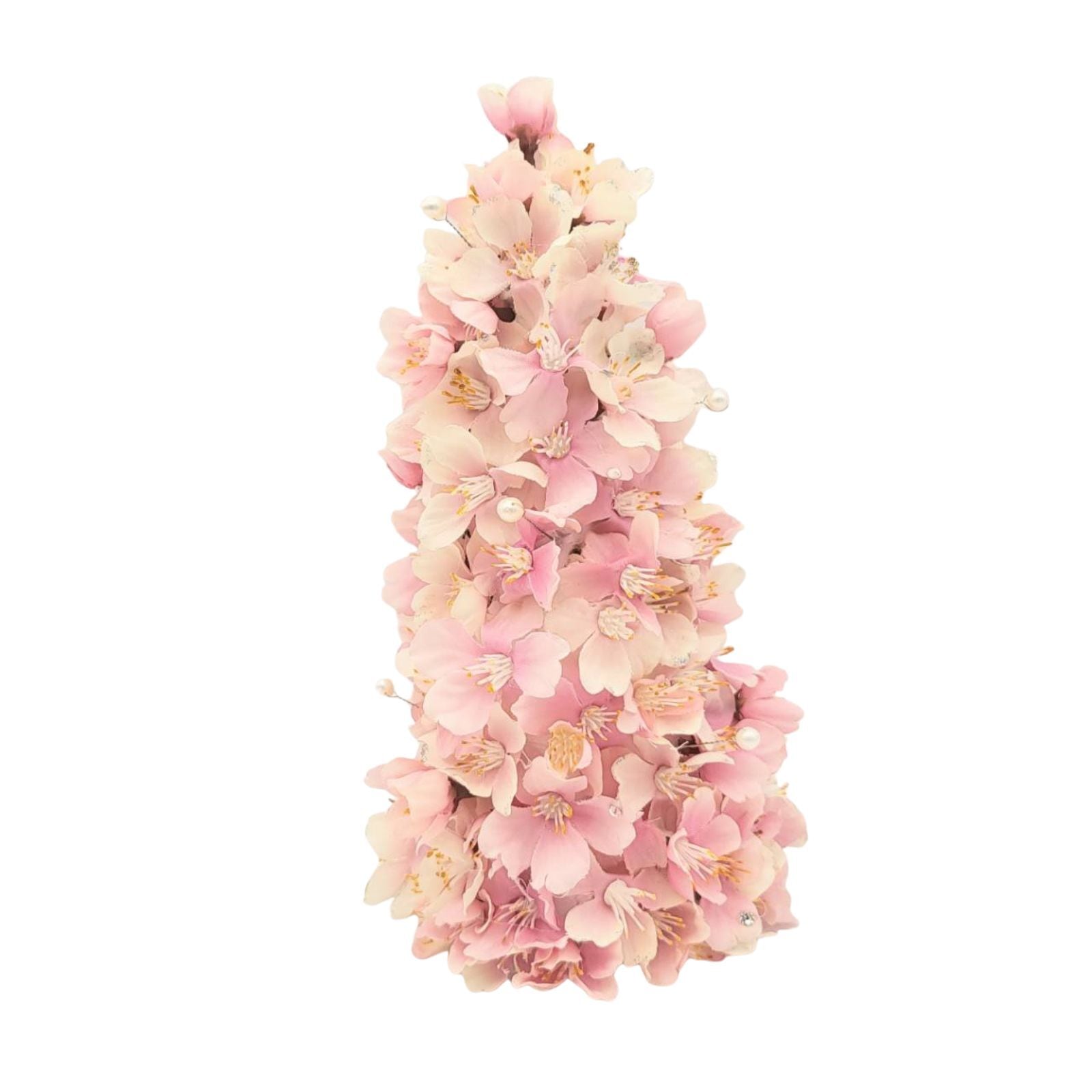 発泡スチロール製コーン台に桜の花を高低差を付けてアレンジ。花びらにシルバーラメやクリスタルを施して華やかさをプラス。針金に通した淡水パールをところどころに配して、桜のエレガントさを表現しました。