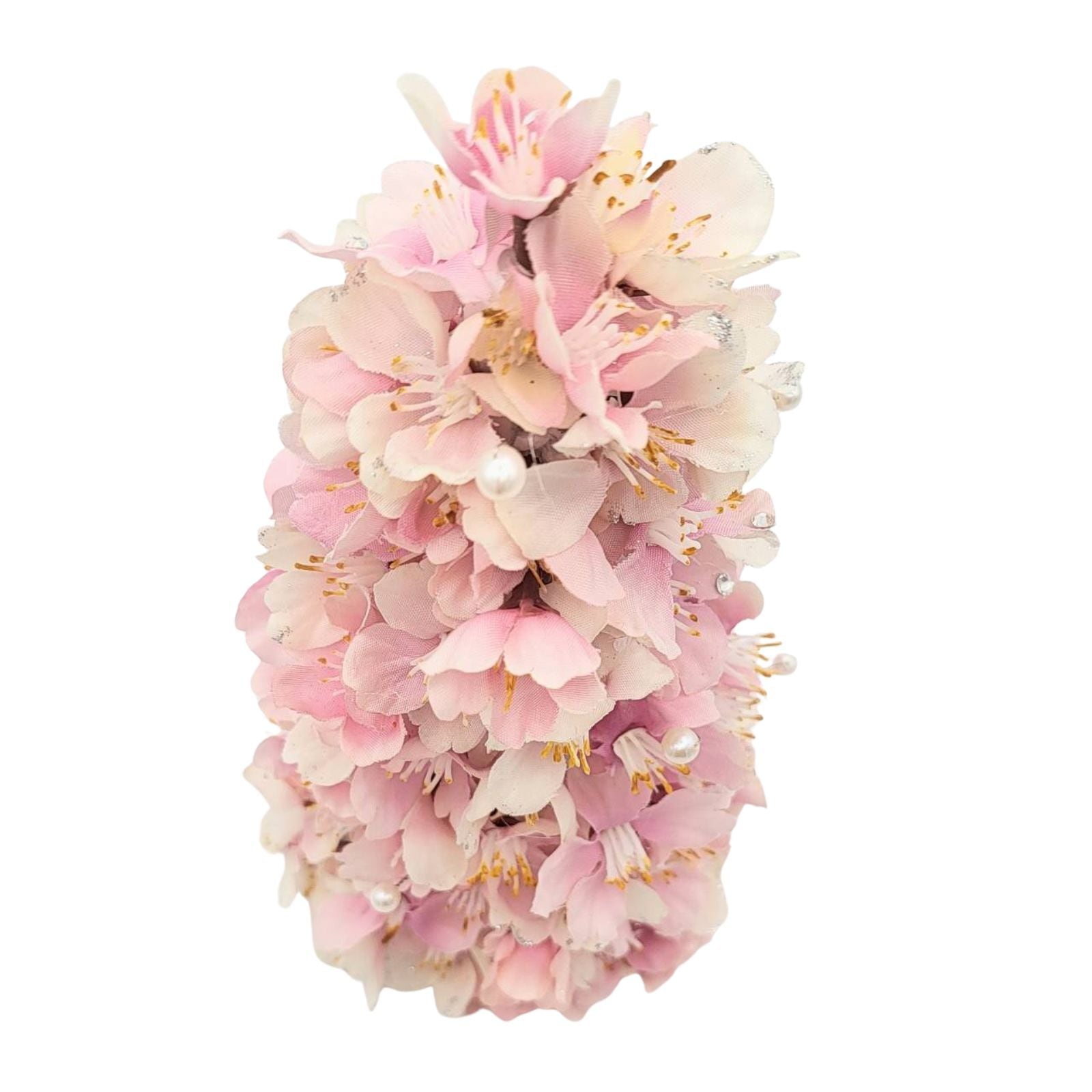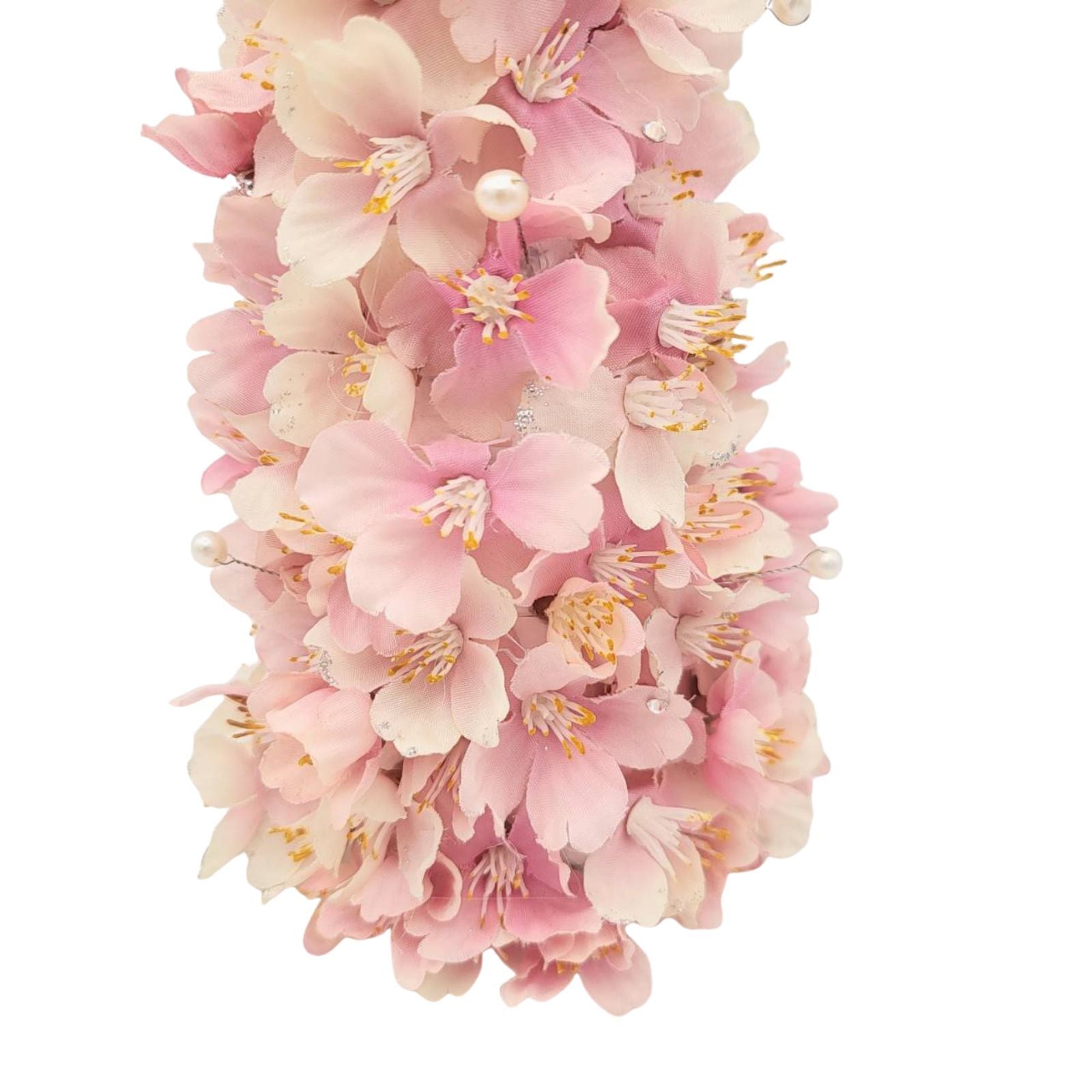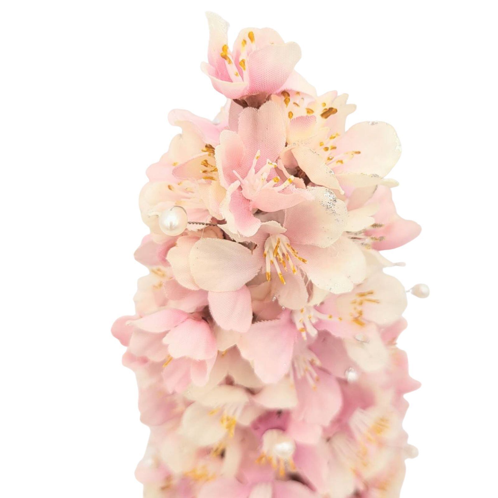 発泡スチロール製コーン台に桜の花を高低差を付けてアレンジ。花びらにシルバーラメやクリスタルを施して華やかさをプラス。針金に通した淡水パールをところどころに配して、桜のエレガントさを表現しました。