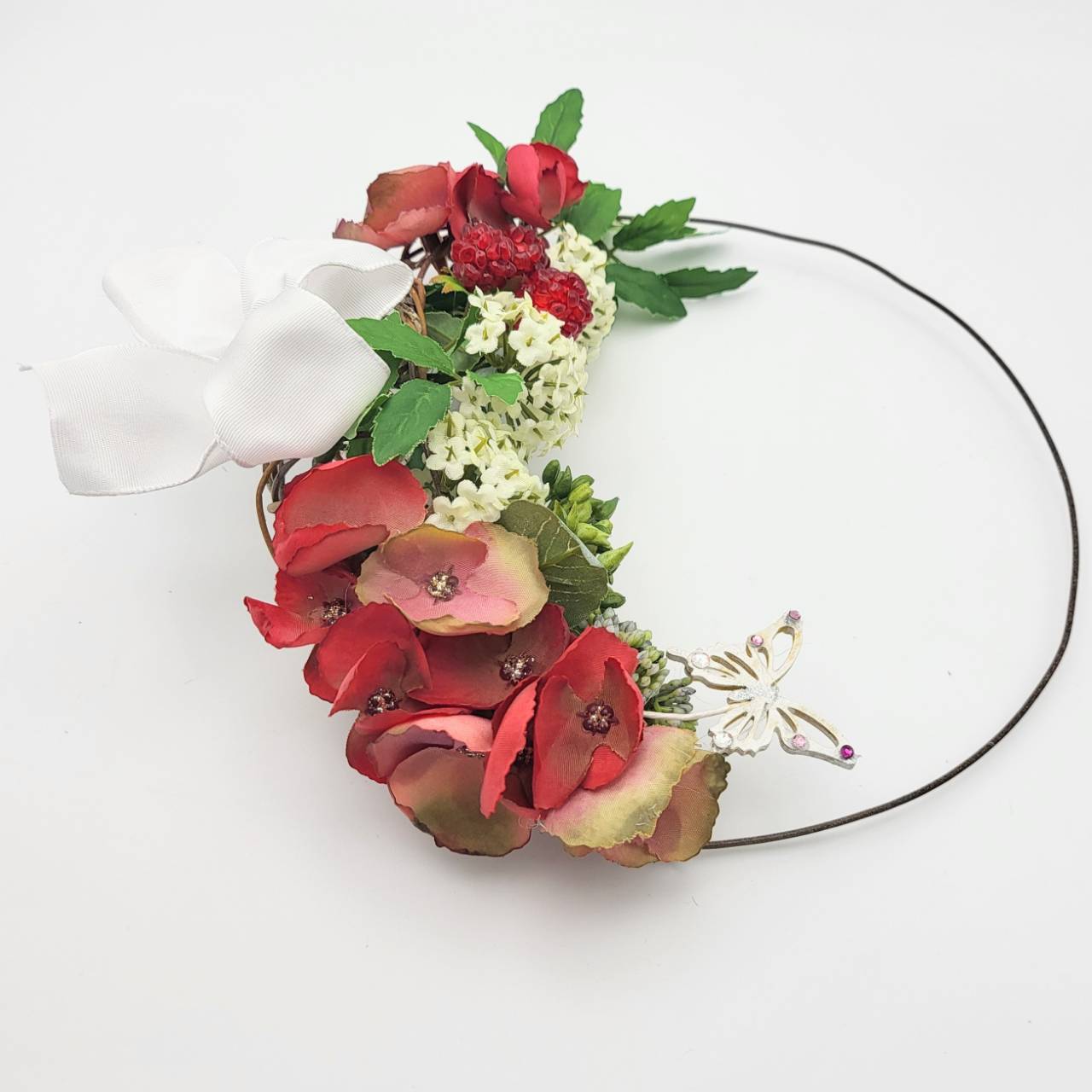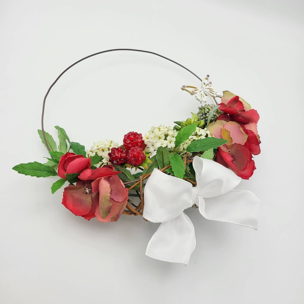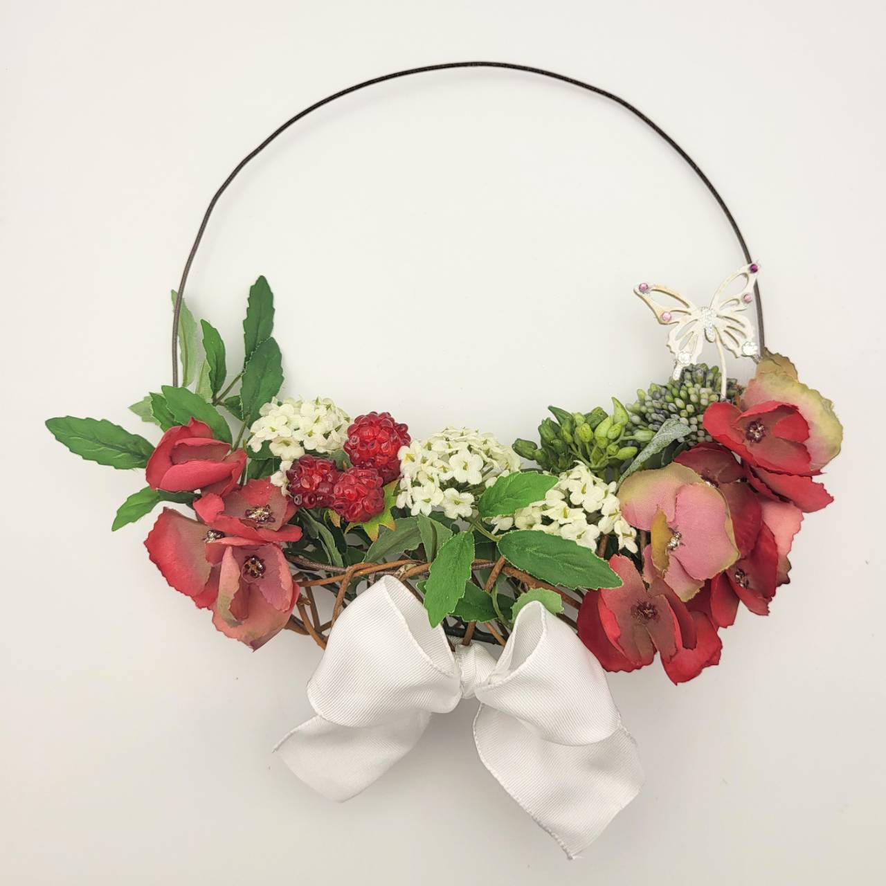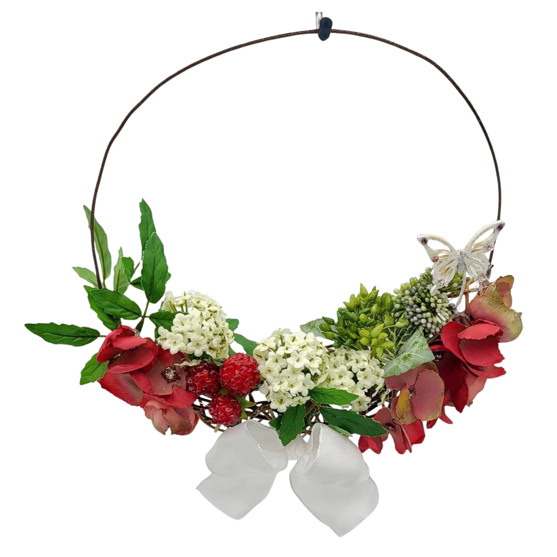 華やかな色合いの紫陽花と小手毬が調和したアーティフィシャルフラワーアレンジメント!紫陽花の柔らかな質感と小手毬の可愛らしいフォルムに加えて、白いリポンと白い蝶がアクセントとして見る人を魅了します。これを壁に掛けることでお部屋に立体感をプラスし、心が和む空間を演出しています。