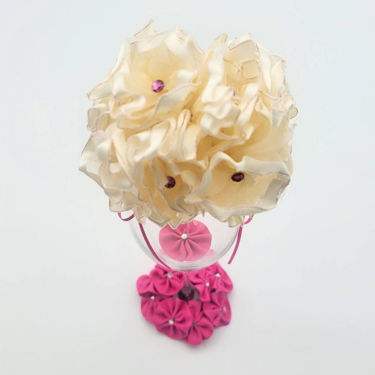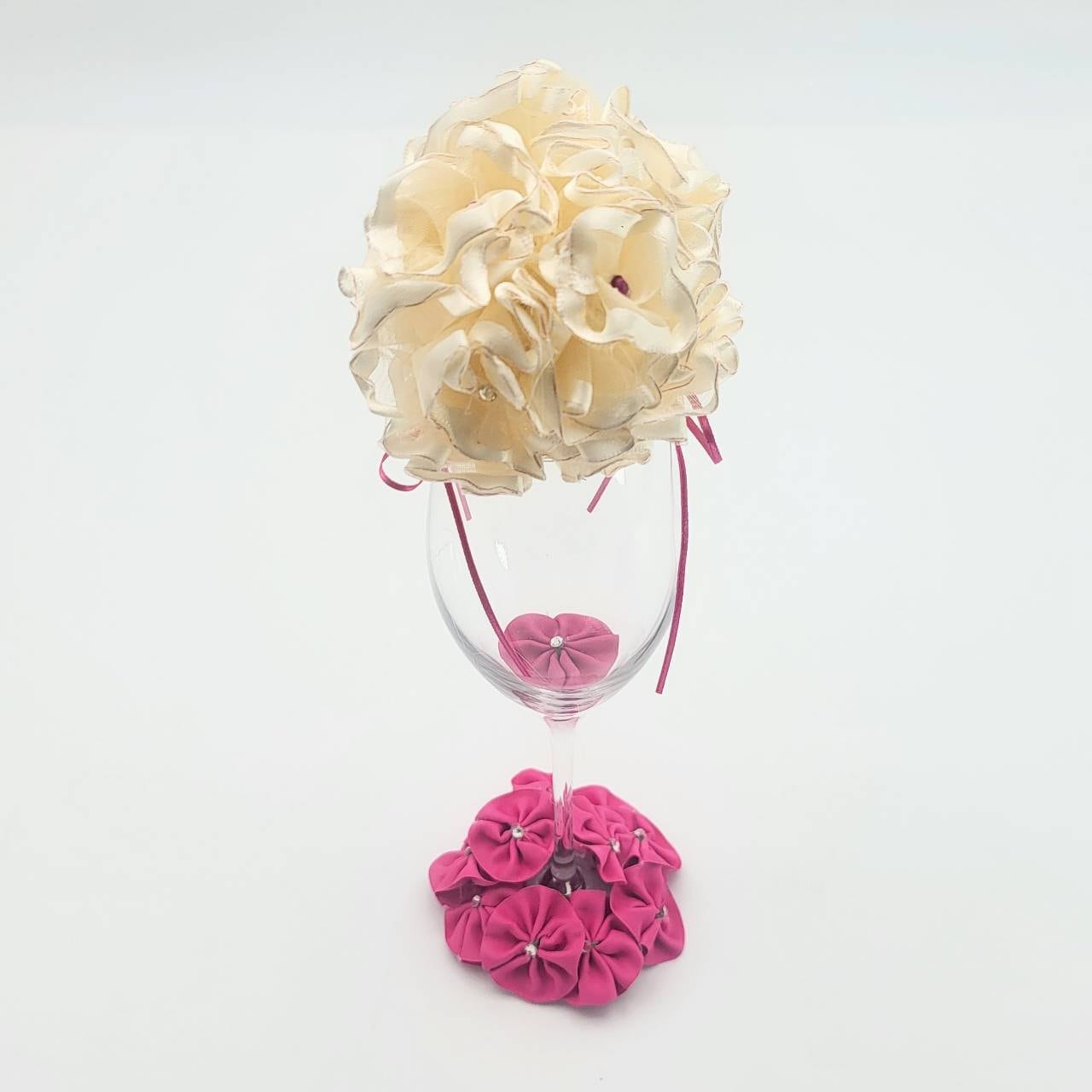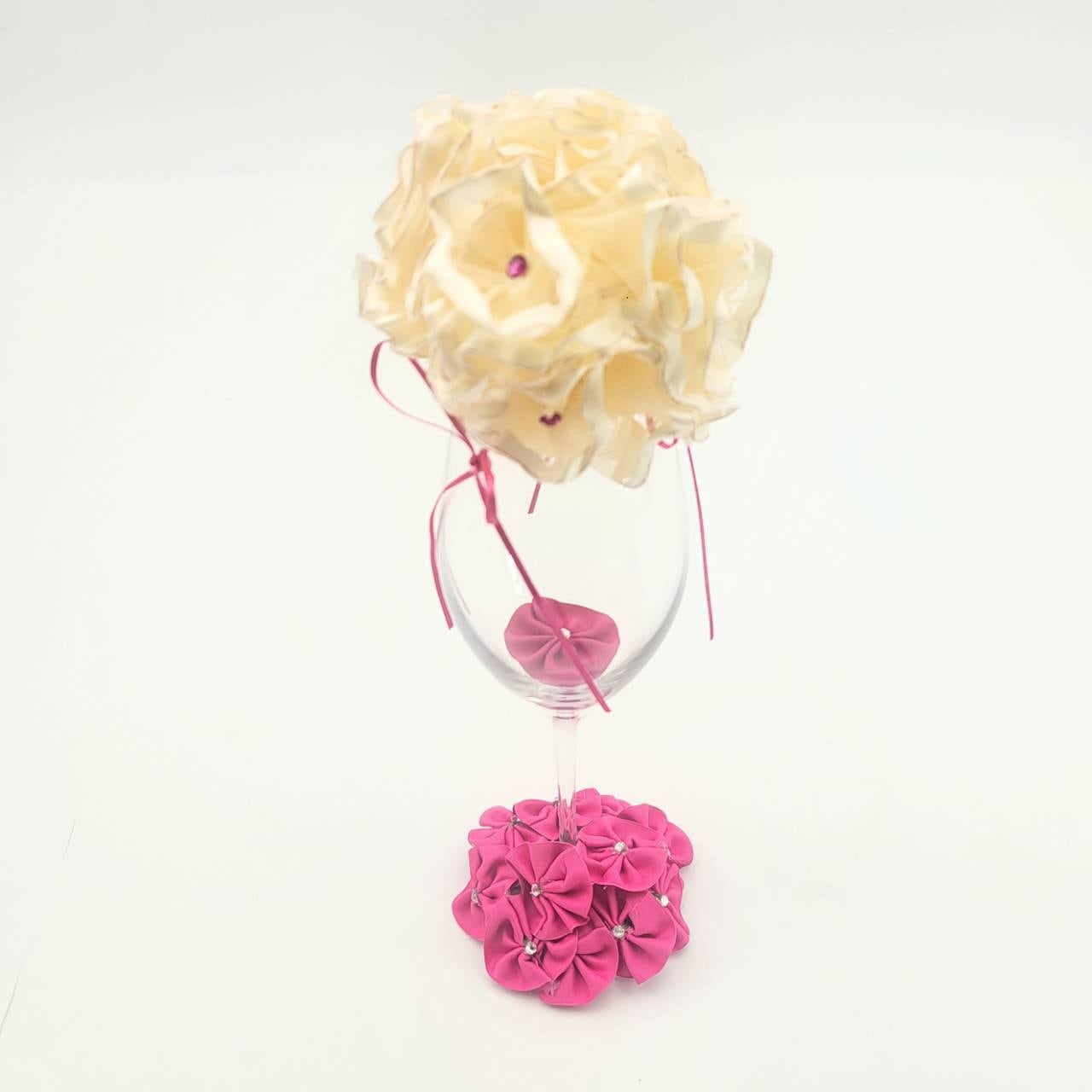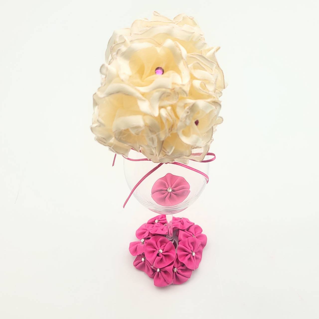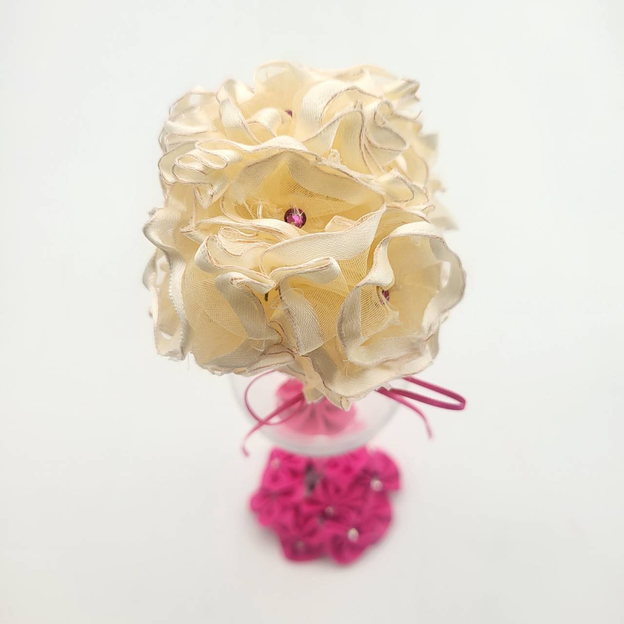 アイボリー色のリボンで作った花(中央にショッキングピンク色のクリスタル)を球状に纏めた塊をグラスの上に載せました。
