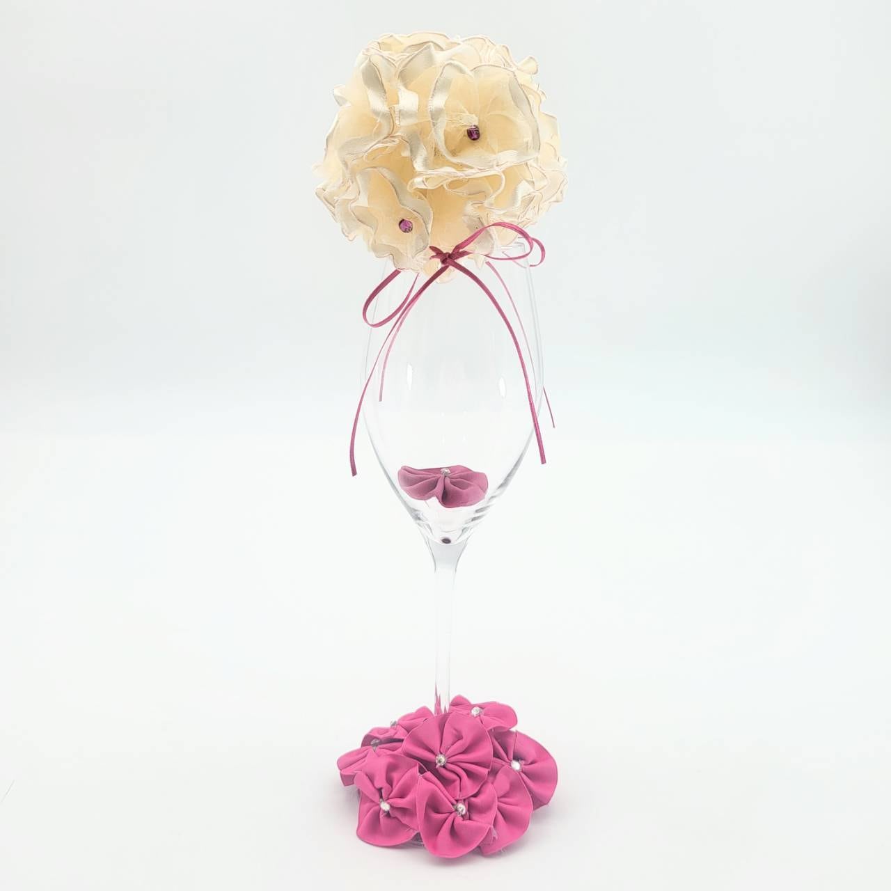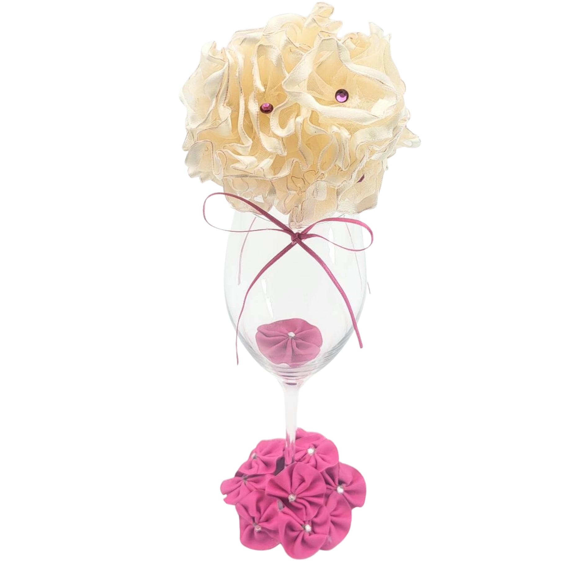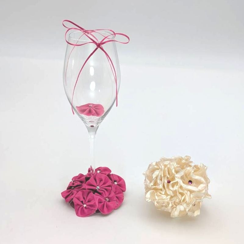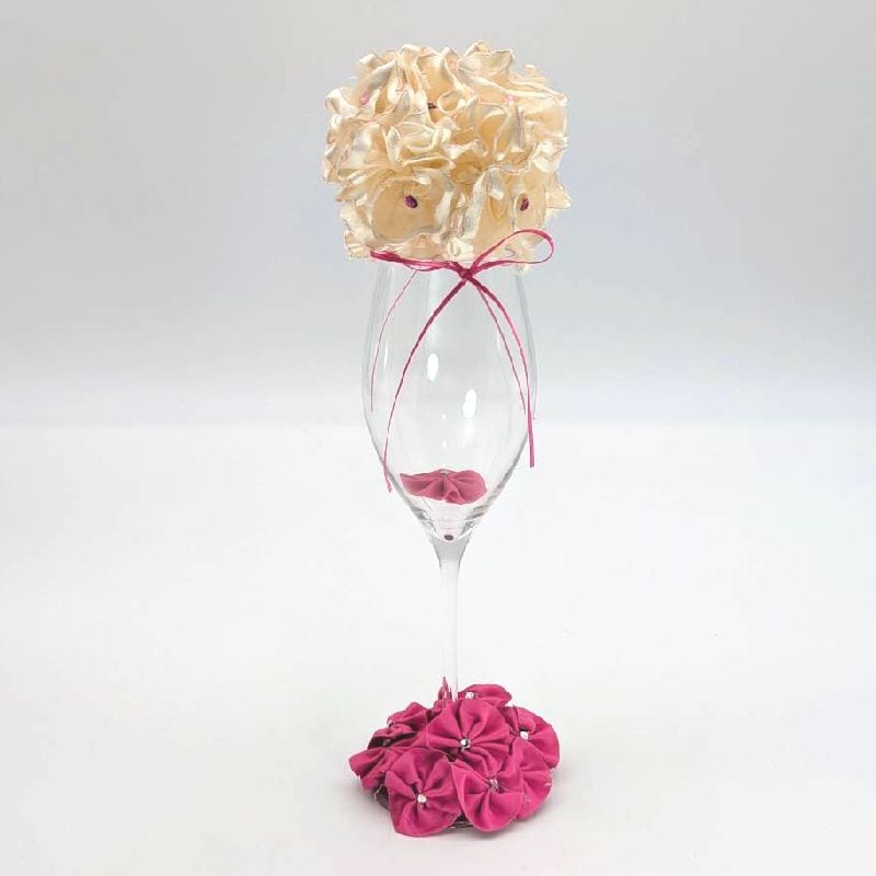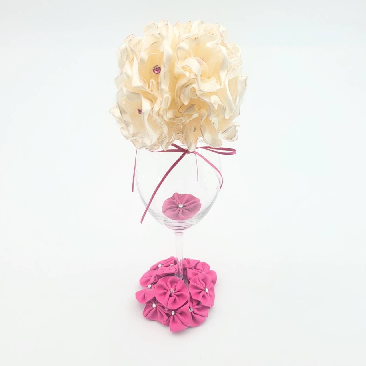 アイボリー色のリボンで作った花(中央にショッキングピンク色のクリスタル)を球状に纏めた塊をグラスの上に載せました。